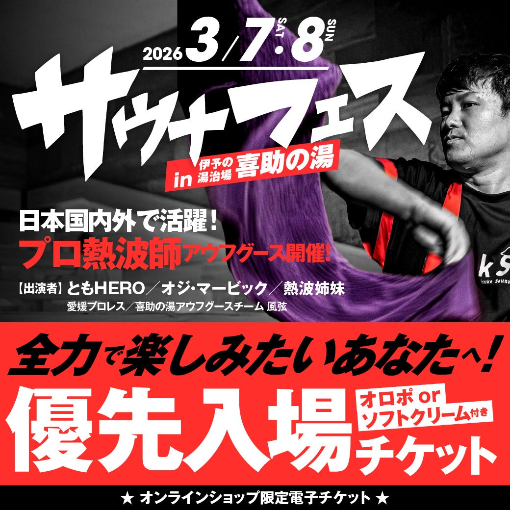 サウナWEEK終盤の2026年3月7日(土)・8日(日)は、伊予の湯治場 喜助の湯にて「サウナフェス in 伊予の湯治場 喜助の湯」を開催します。国内外で活躍するプロ熱波師によるアウフグースイベントを2日間にわたり実施し、サウナ×熱波×エンタメの熱量を館内で体感できる特別な2日間をお届けします。