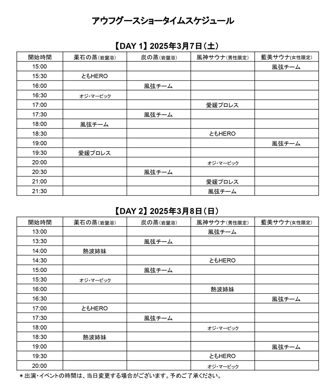 出演者は、ACJ個人部門優勝の「オジ・マービック」をはじめ、「ともHERO」「熱波姉妹(3月8日(日)のみ特別出演)」、喜助の湯アウフグースチーム「風弦」、さらにkSc公式アンバサダー「愛媛プロレス(3月7日(土)のみ特別出演、出演レスラーは後日発表)」と、フェスにふさわしいラインナップが揃いました。時間帯や出演者によって表情を変えるサウナ室は、訪れるたびに新しい体験が待っています。