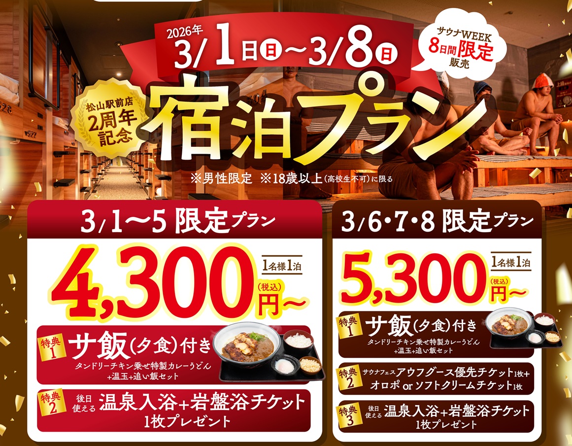 「サウナ&スパ・ホテル 喜助の宿 松山駅前店」にて、オープン2周年を記念し、2026年3月1日(日)〜3月8日(日)のサウナWEEK期間限定で、特典付き宿泊プランを発売いたします。